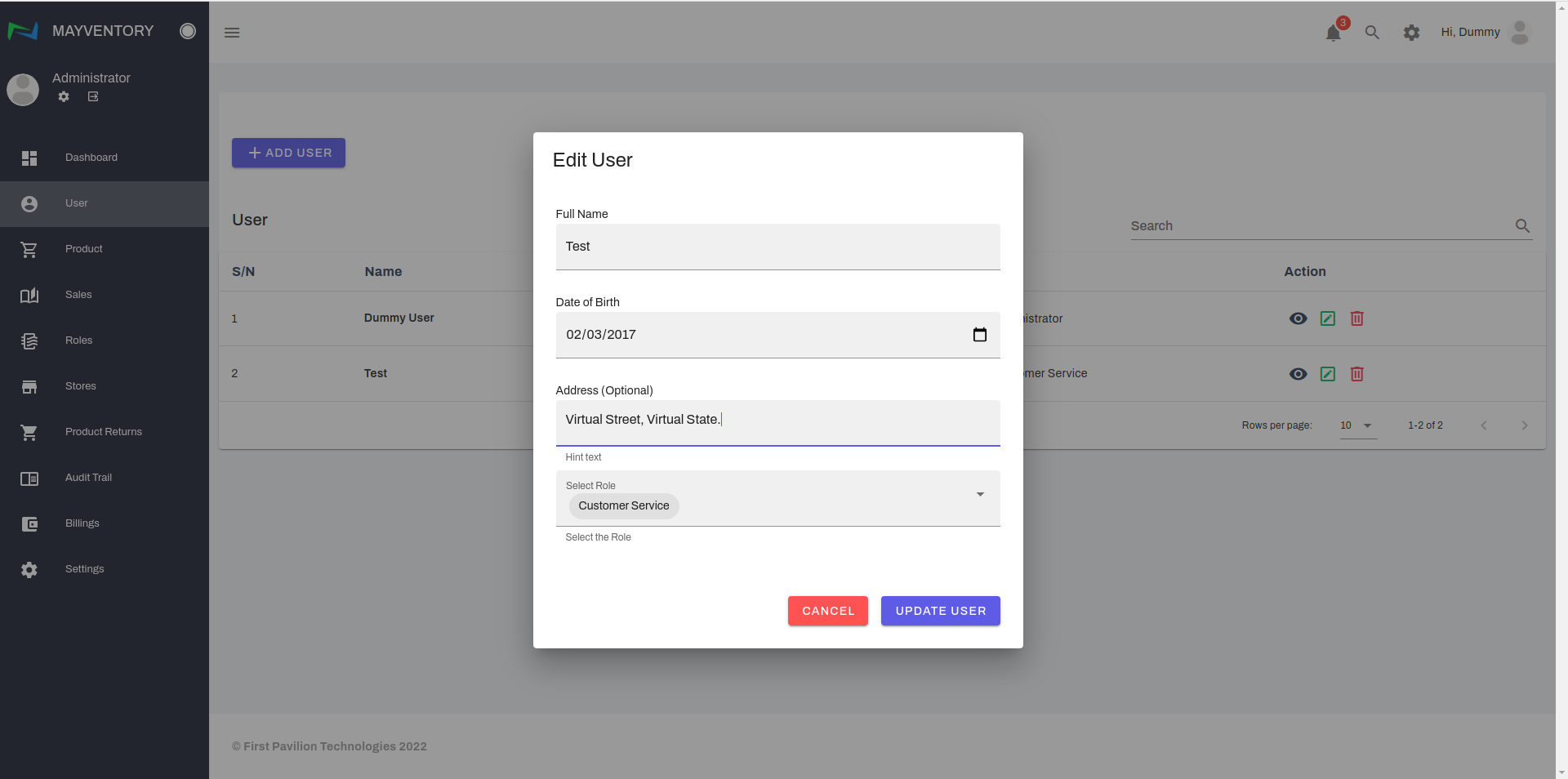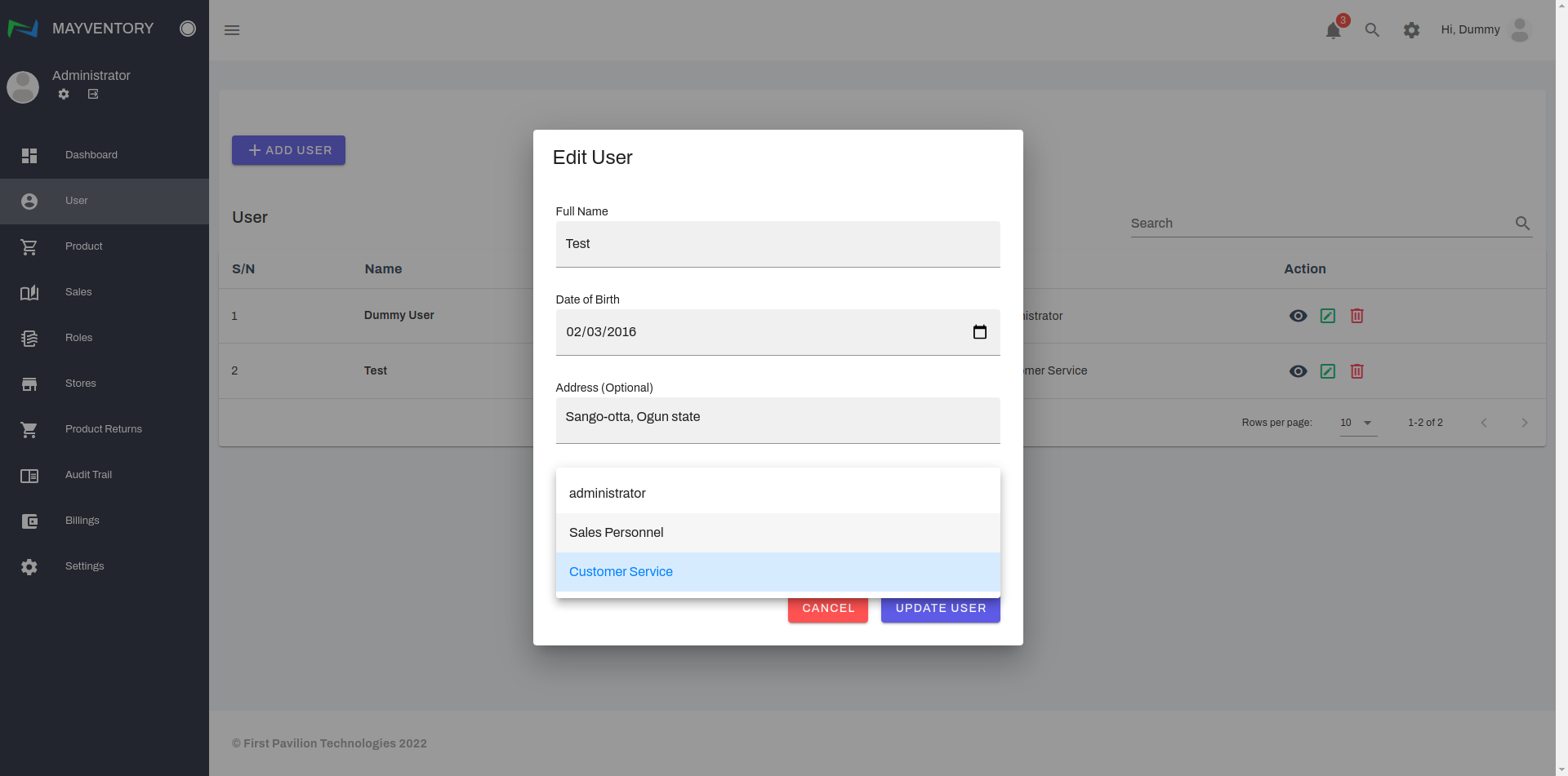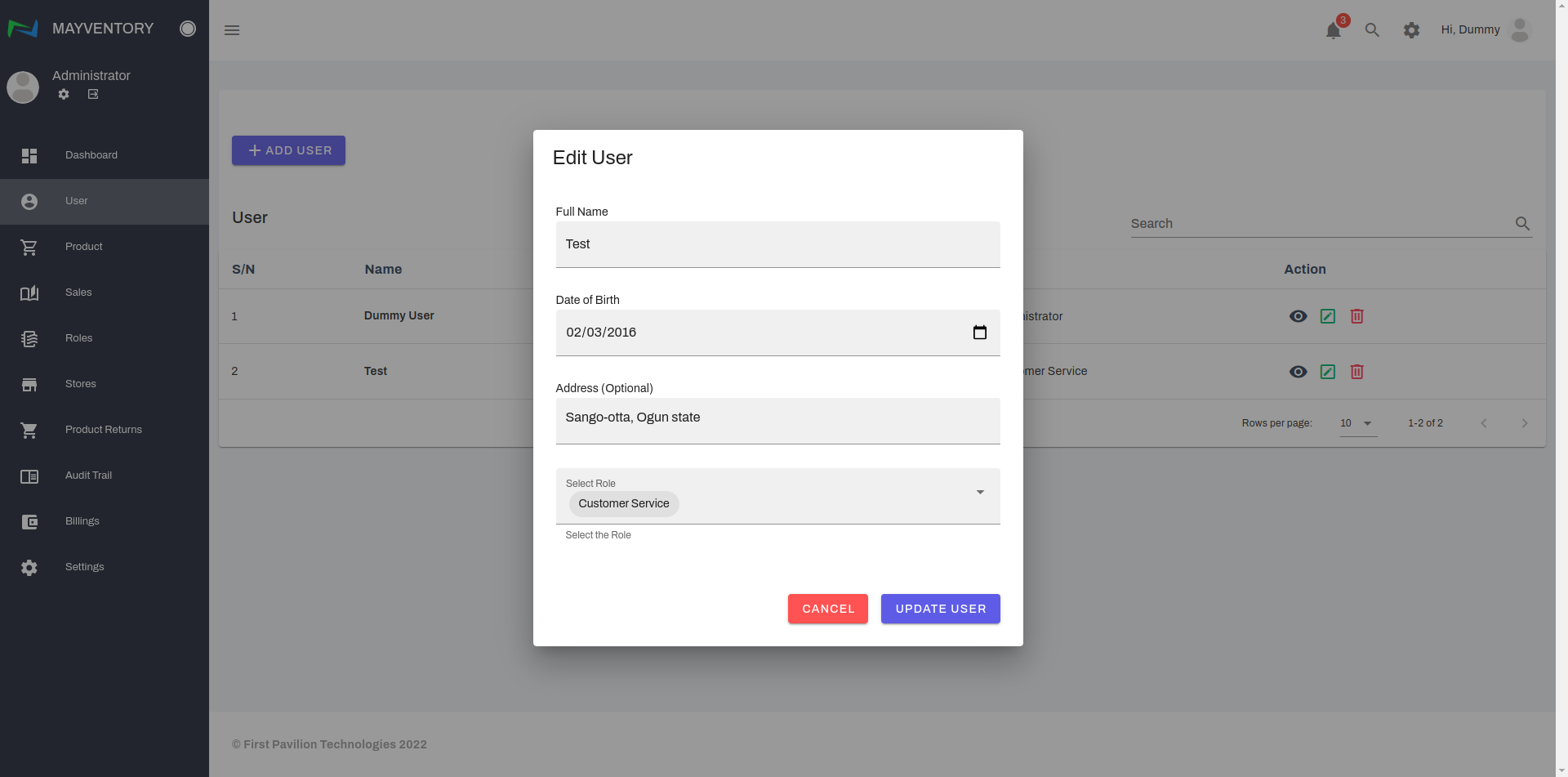 - Edit the details to your satisfaction and click on Update User to save your edits. In the example below, we edited the address from Sango-otta,Ogun state to Virtual Street, Virtual State.