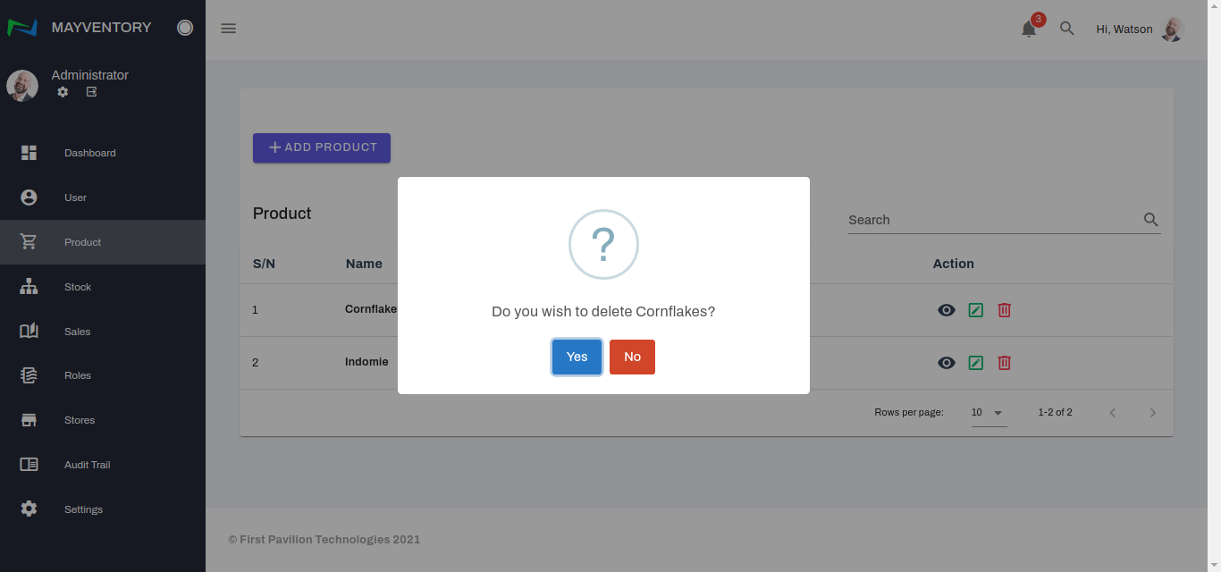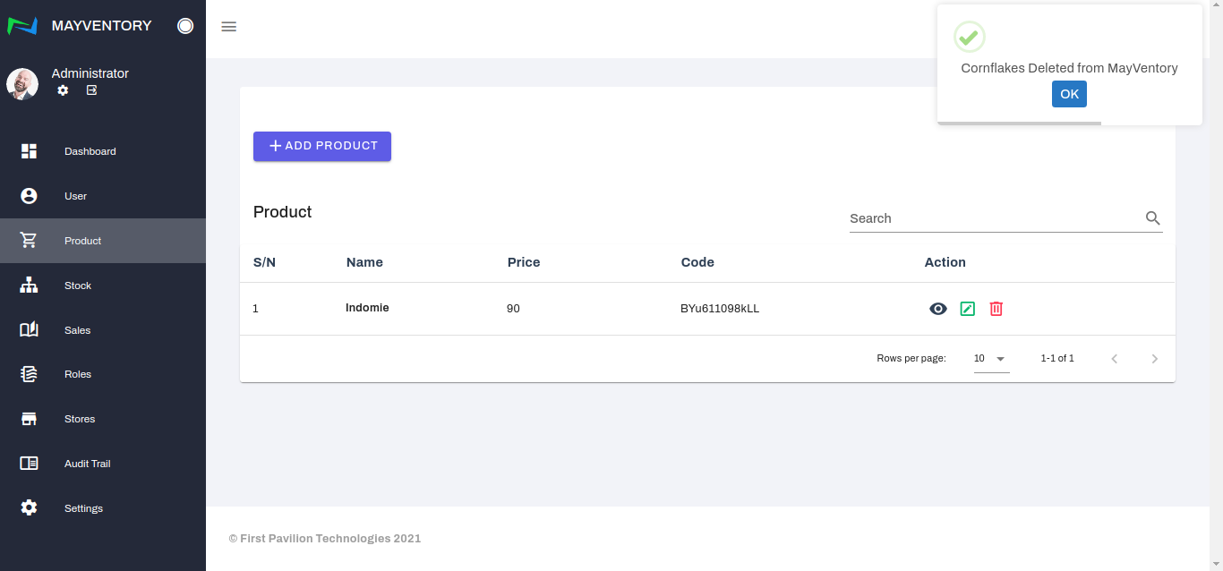 - You would get a prompt asking you to confirm if you really want to delete the Product. If yes, select the Yes box and you would see a tick at the top-right corner like in the image below when you successfully delete the product. If no, select the No box and you would return back to the Product page.