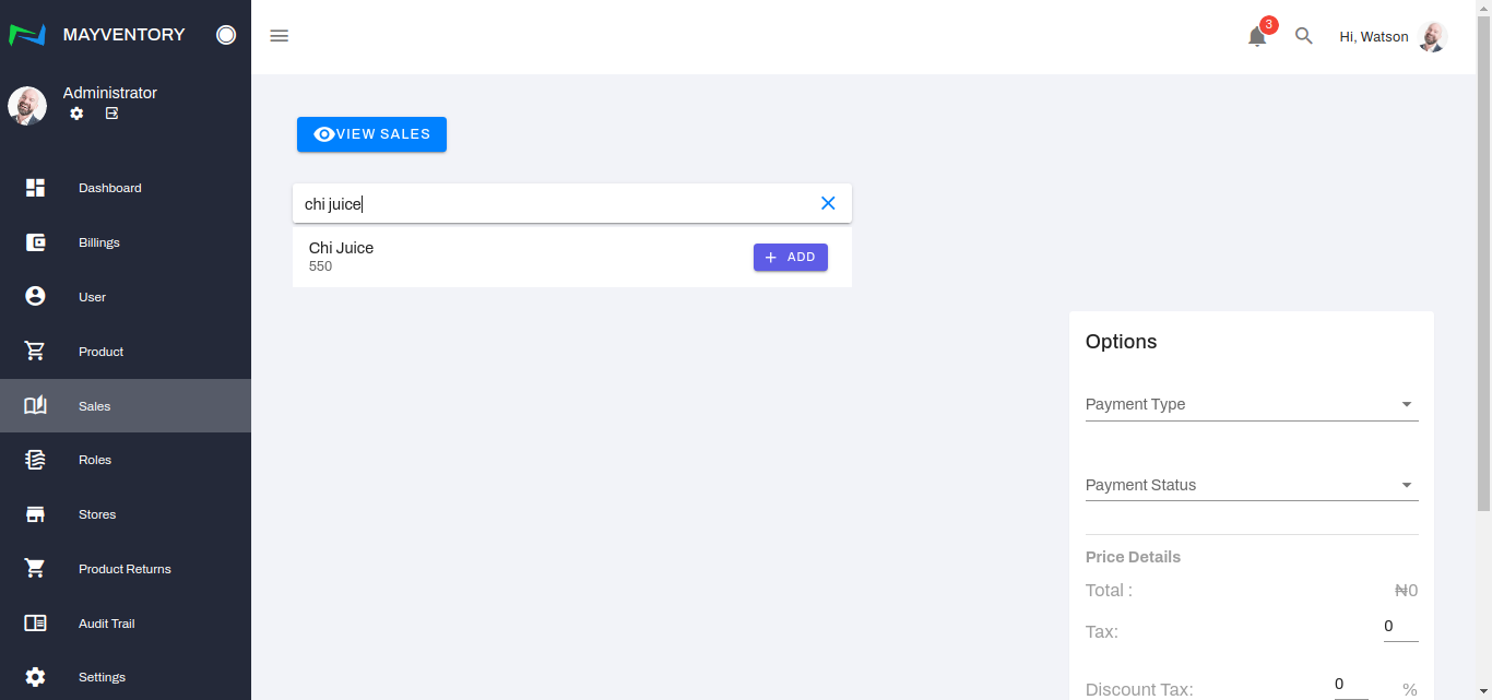 - Click on the search box and type in the product that has just been sold or is about to be sold. In our example(image below), it is Chi Juice.