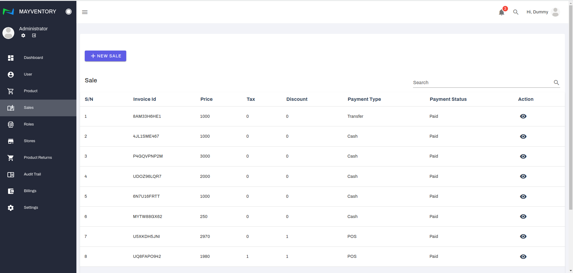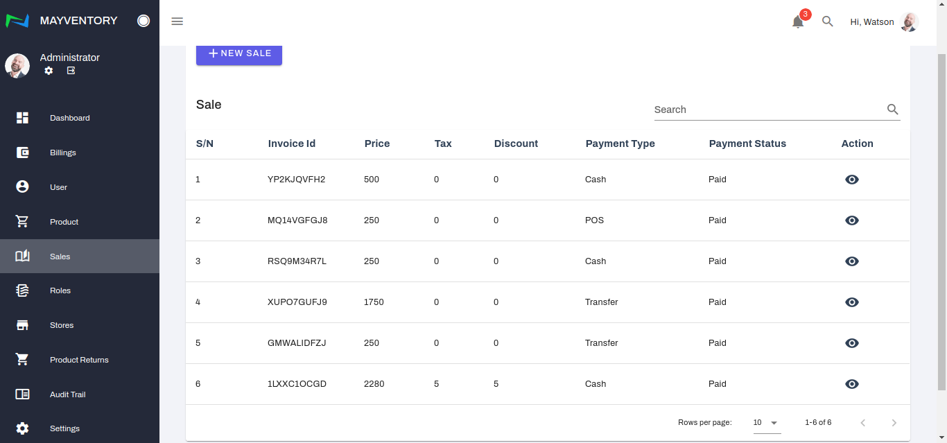 - Locate the invoice you want to print and under the action column, click on the eye-like icon. You immediately get taken to a new page.