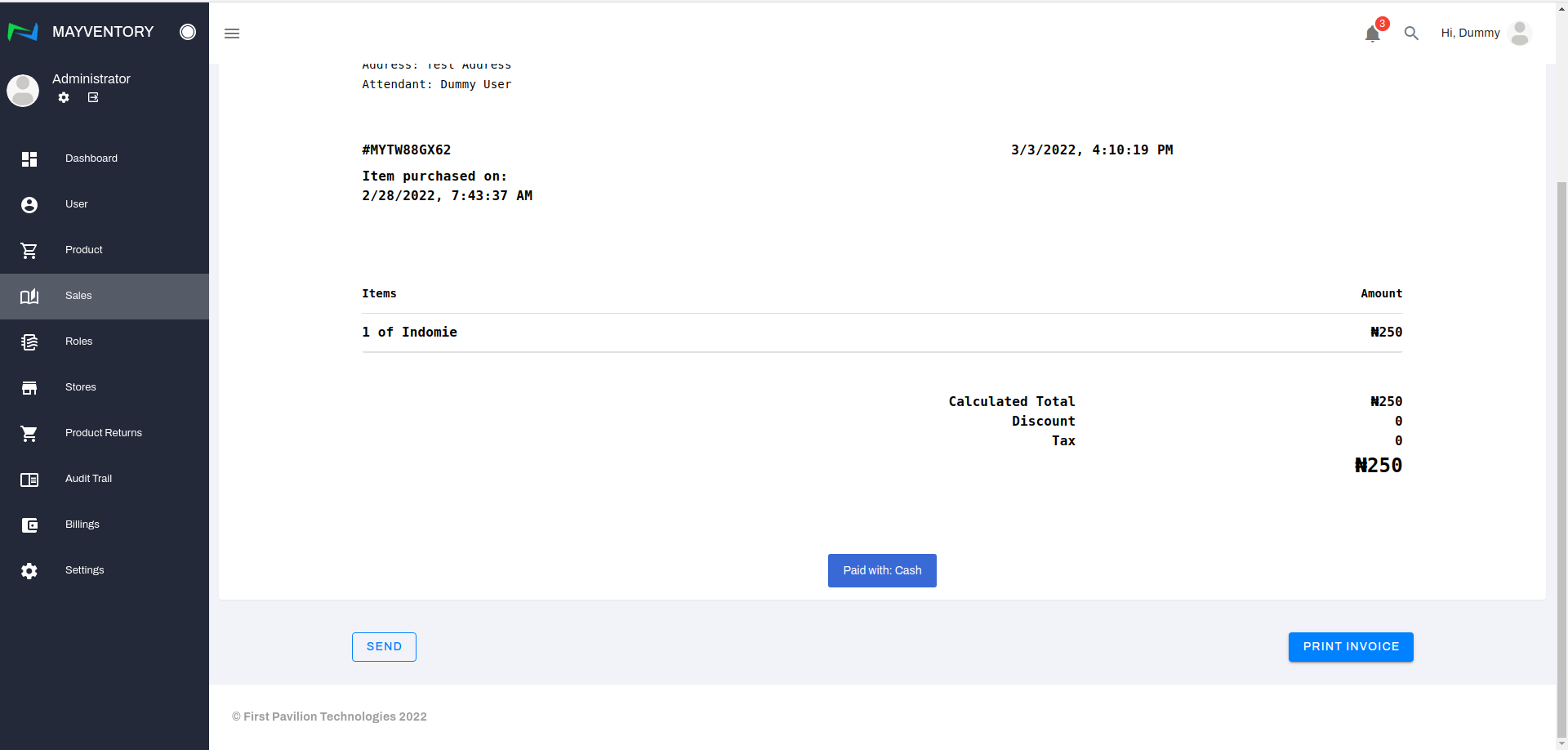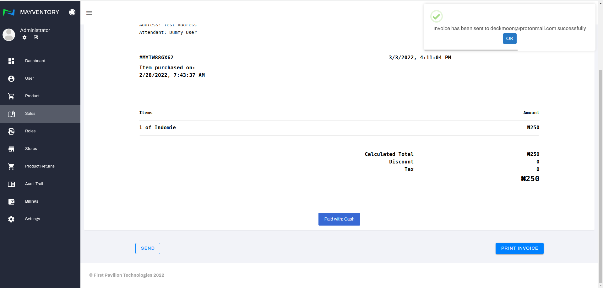 - Action: This contains a button used to perform advanced action on a recorded sale. When you click on the eye-like icon, you will get directed to a page where you can perform advanced activities like sending an invoice via email or printing an invoice out.