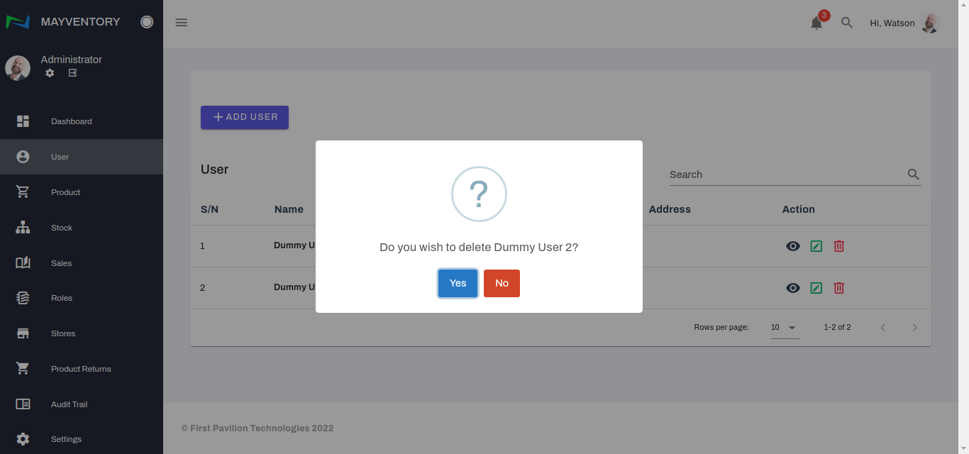 - You would get a prompt asking you to confirm if you really want to delete the User. If yes, select the Yes box and you would see a tick at the top-right corner like in the image below when you successfully delete the User. If no, select the No box and you would return to the User page.